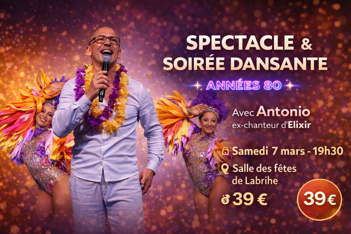 Plongez dans l’ambiance inoubliable des Années 80 avec Antonio, ex chanteur d’Elixir, et sa troupe, pour un spectacle haut en couleur qui vous fera chanter, danser et revivre les plus grands tubes de cette décennie mythique. Une soirée rythmée par des chansons emblématiques, une ambiance chaleureuse et un moment de partage à vivre entre amis ou en famille.