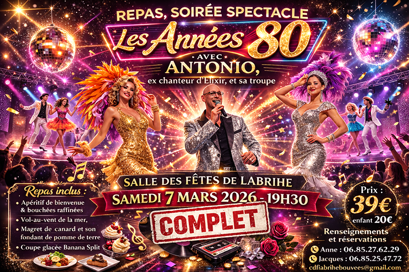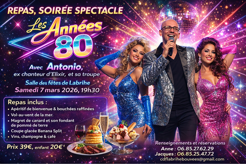 Le comité des fêtes de Labrihe Bouvées vous invite pour une soirée exceptionnelle placée sous le signe de la musique, de la convivialité, de la bonne humeur et des souvenirs!